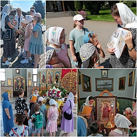 Ребята с интересом посмотрели верхний храм, познакомились с житием святого великомученика и целителя Пантелеимона, память которого совершалась Церковью как раз в день экскурсии, приложились к иконе с частицей его святых мощей, а также посетили большой клирос, где исполнили песнопение «Царю Небесный».
