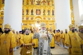 Затем Святейший Патриарх Кирилл совершил чин великого освящения воссозданного кафедрального Спасо-Преображенского собора и Божественную литургию в новоосвященном храме.